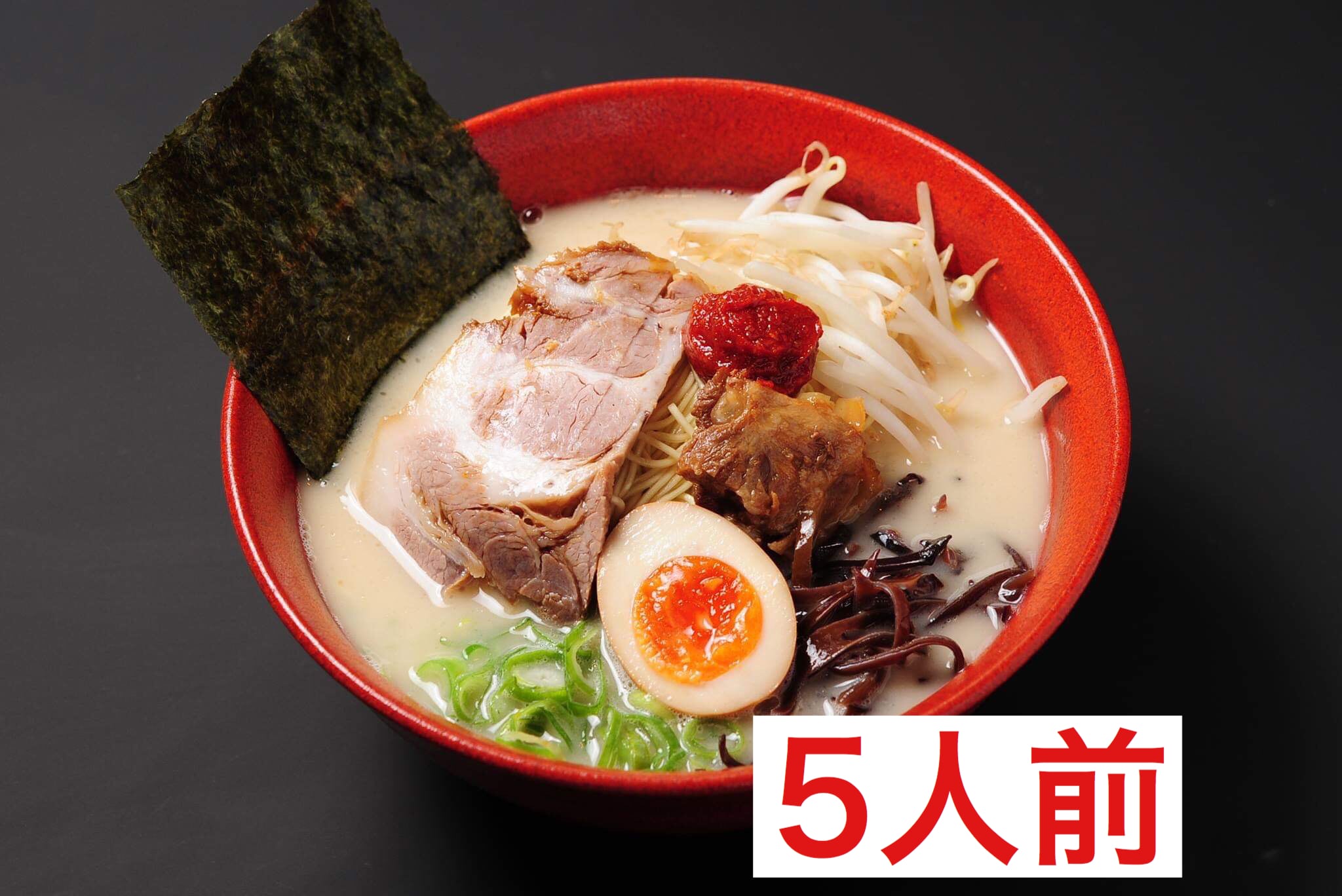 ※チャーシューは国産の豚肩ロースを使用し、豚軟骨肉に、福岡名産の福岡ねぎに、キクラゲと特製煮玉子付きです。